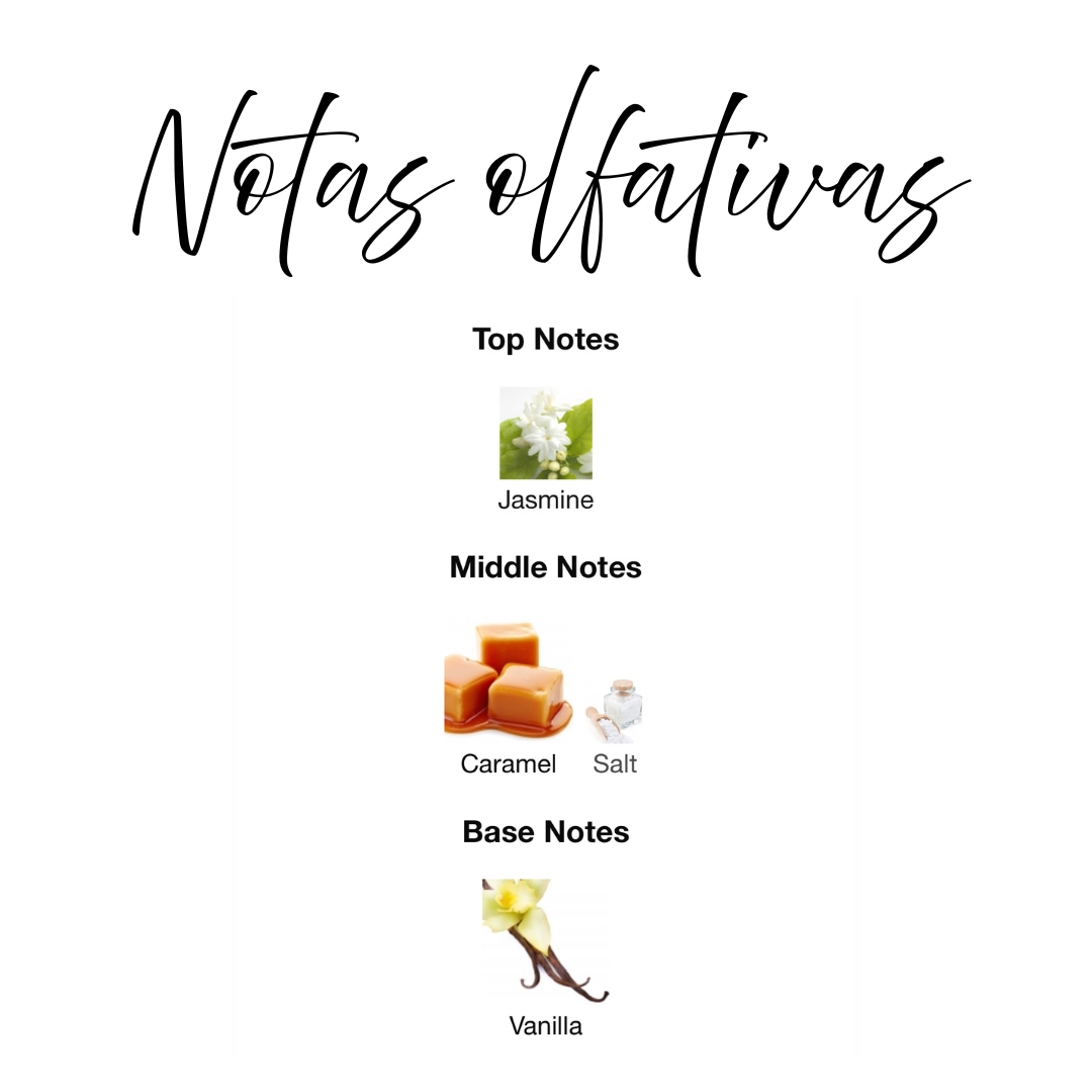 • Notas de Corazón: Jazmín floral seductor 🌸 y caramelo cremoso 🍮, aportando un toque gourmand irresistible.