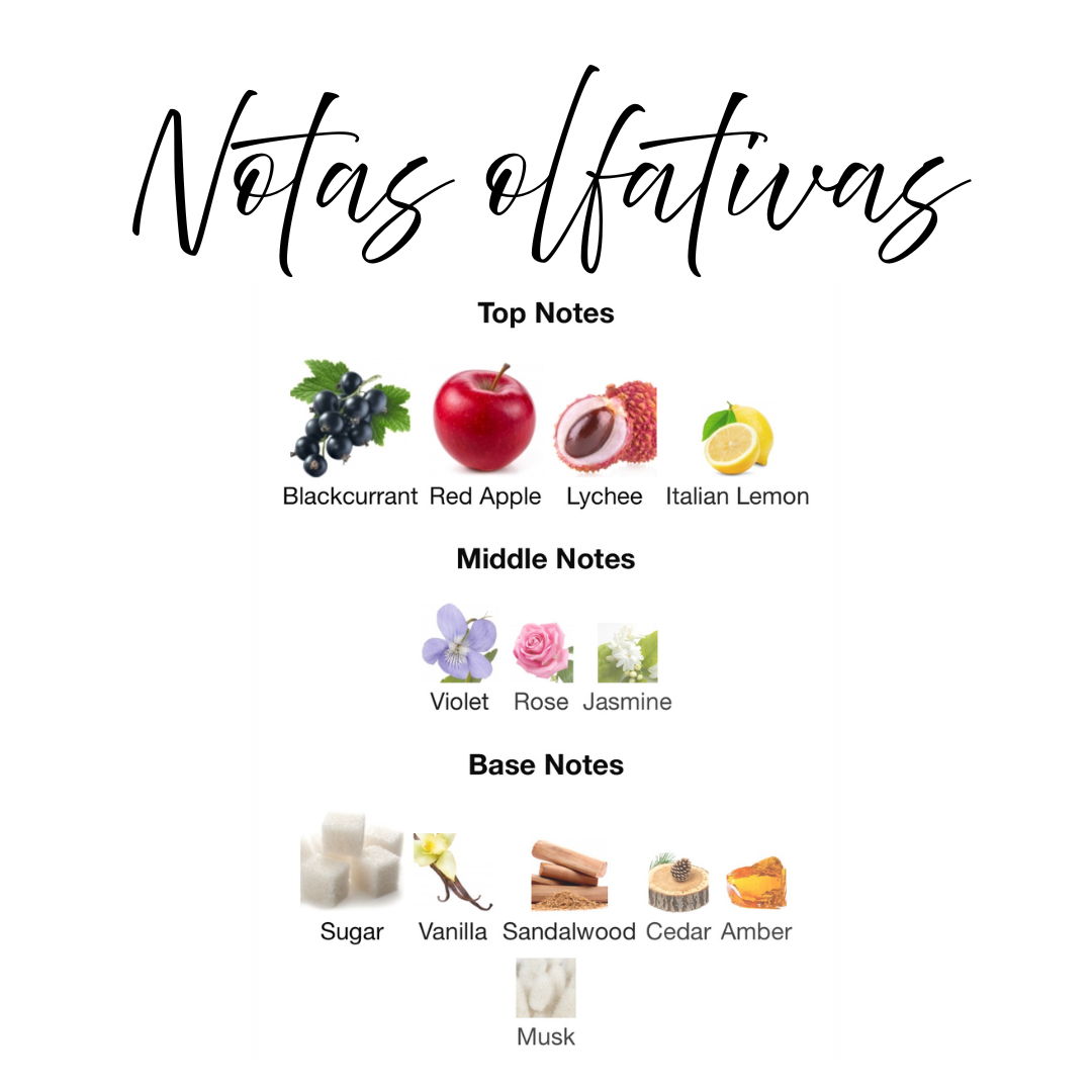 Notas de Salida: Grosella negra jugosa 🫐, lichi dulce 🍒, manzana roja crujiente 🍎 y limón italiano cítrico 🍋, para un inicio chispeante.
